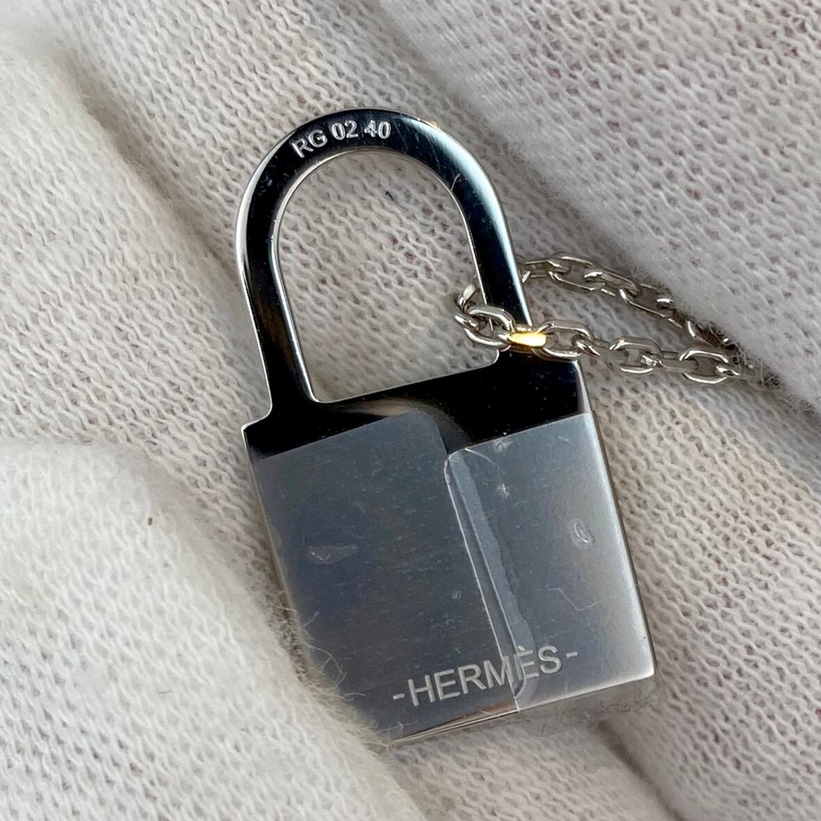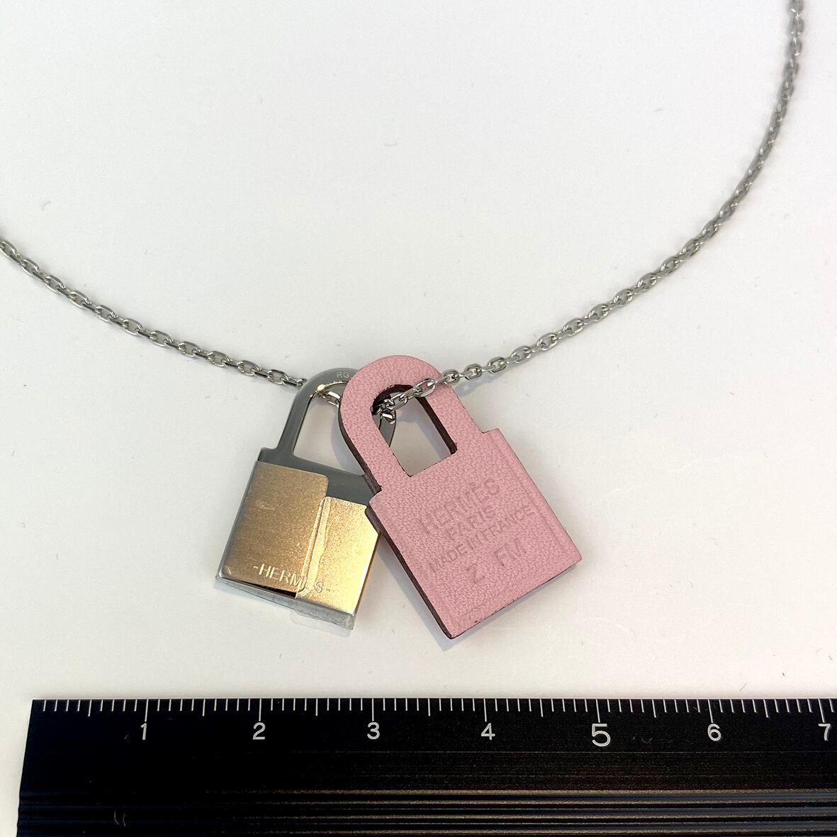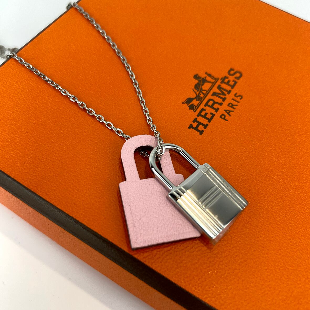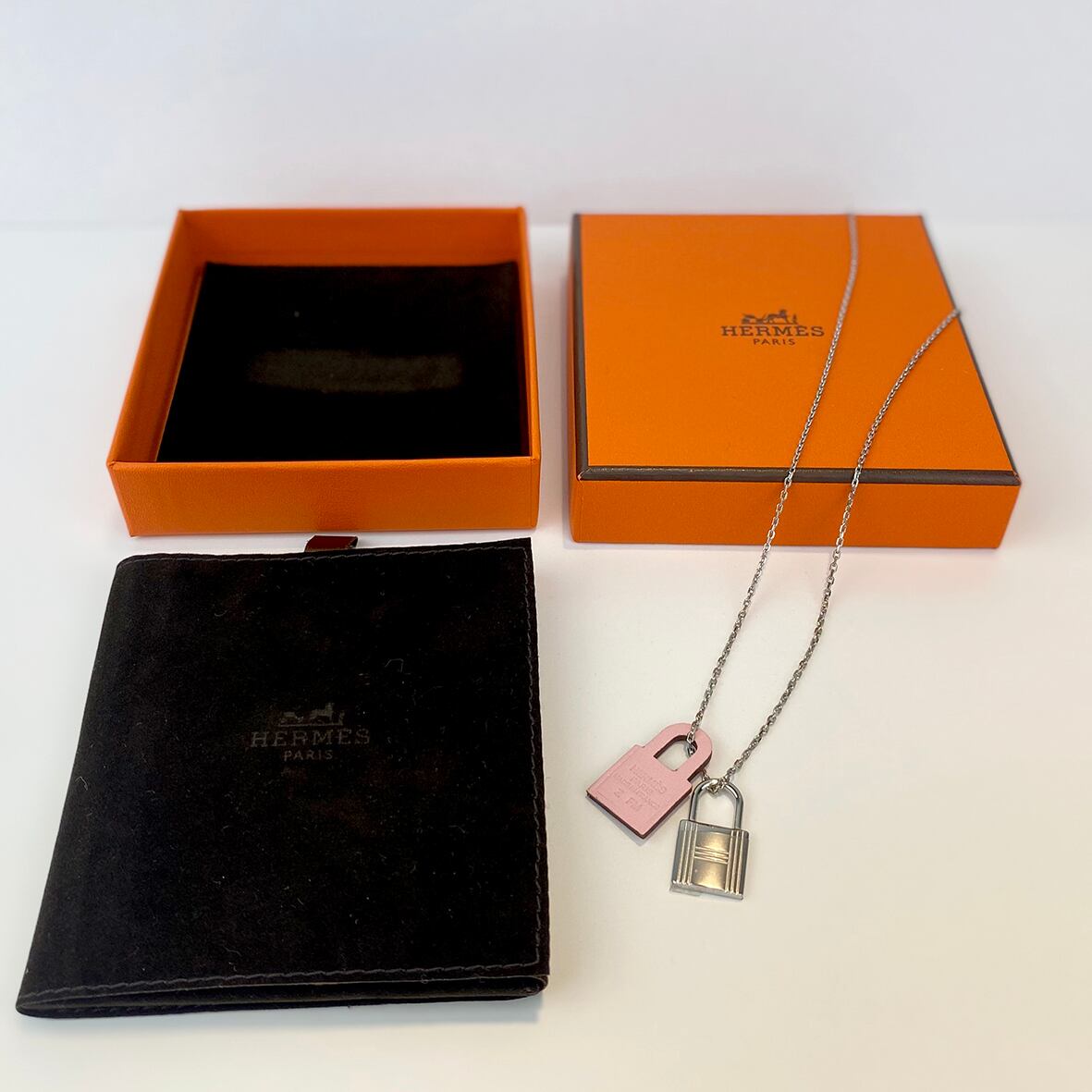 エルメスを象徴するカデナ(南京錠)モチーフのチャームペンダントセット。上品なシルバーと淡いピンクのパドロックが、スタイルにさりげないアクセントをプラスします。