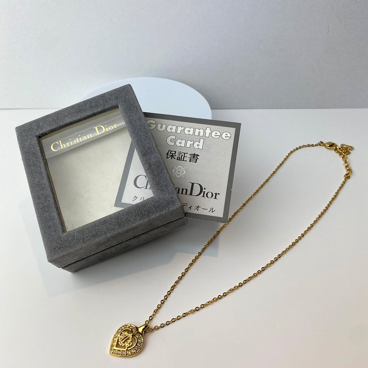 立体感のあるハートフレームの中央には、クラシカルなCDロゴが美しく浮かび上がり、周囲には繊細にあしらわれたラインストーンがきらめきを添えています。