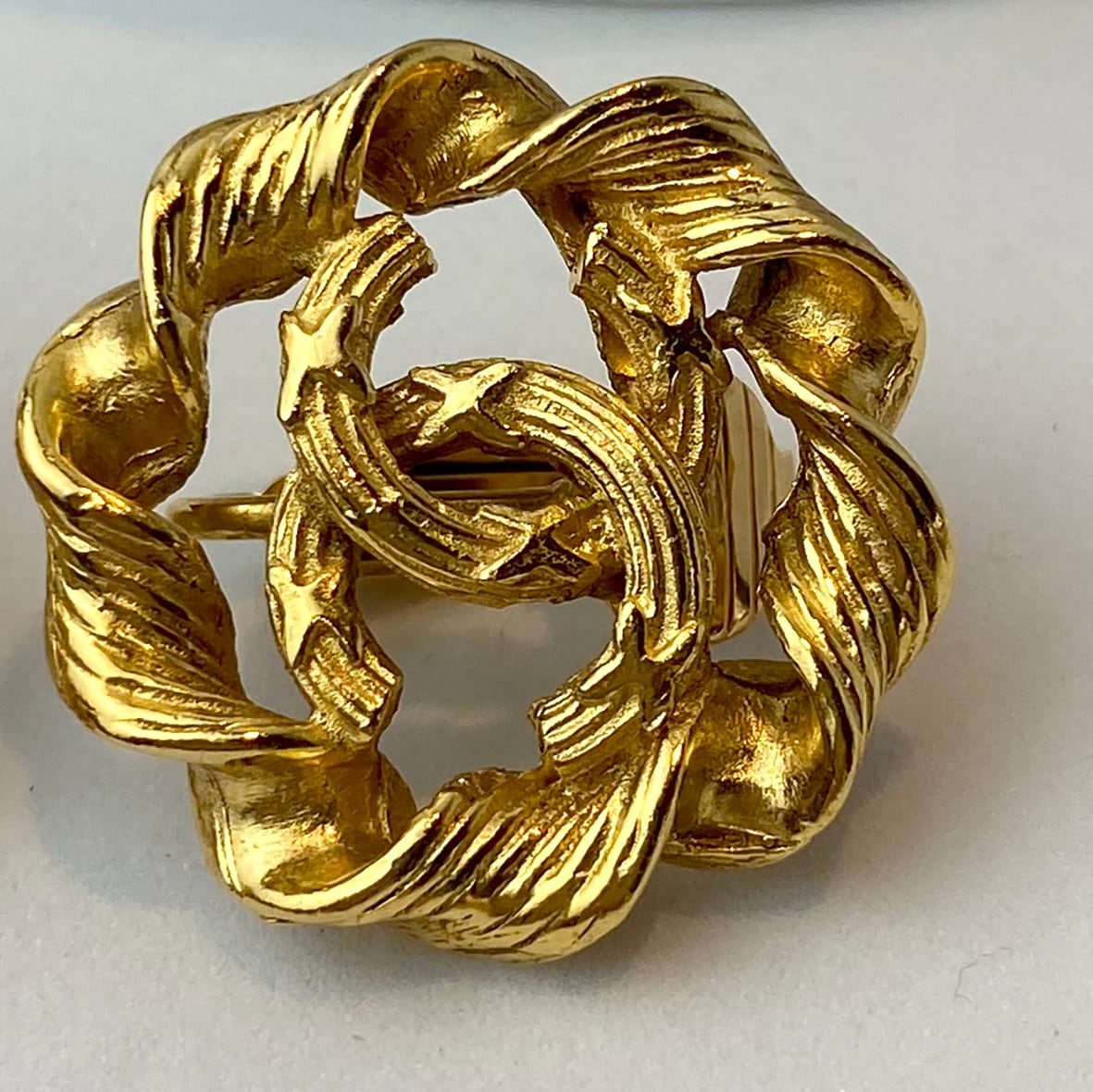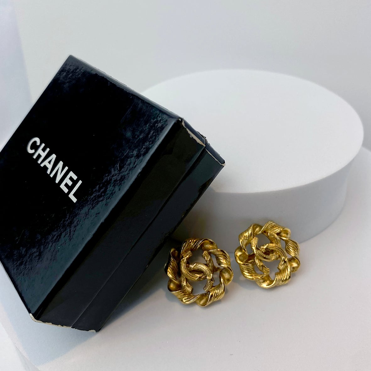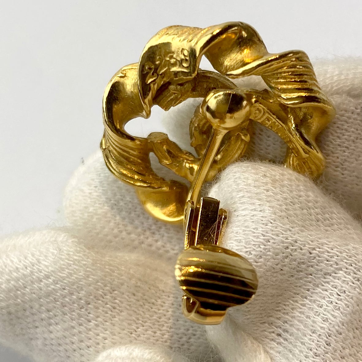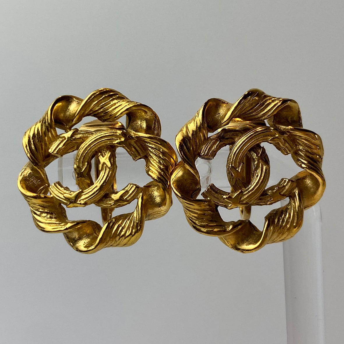 CHANELのヴィンテージイヤリング。まるでバラの花を抽象化したような、ツイスト状のリーフモチーフが連なった立体的なデザインは、横顔にクラシックで華やかな存在感をもたらします。