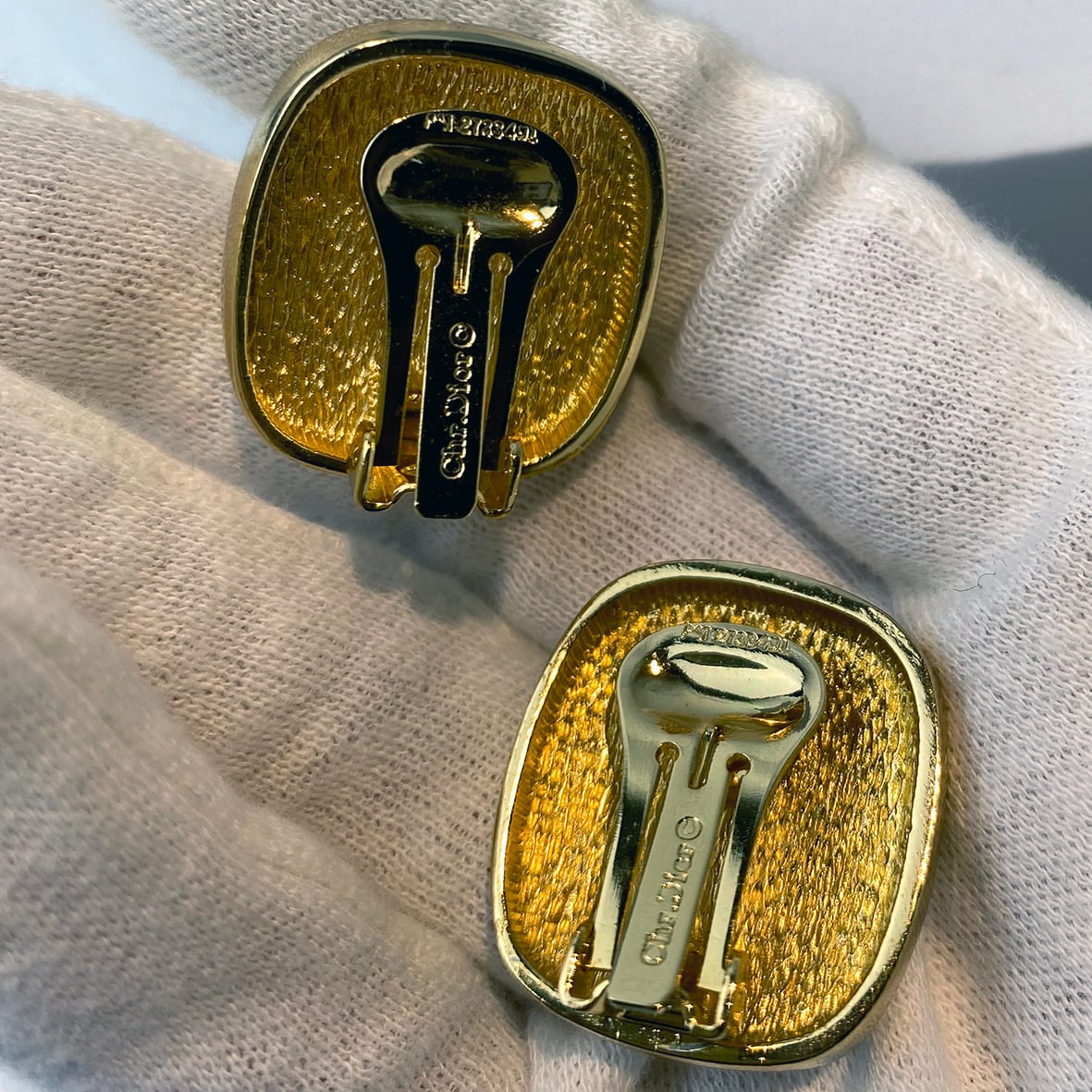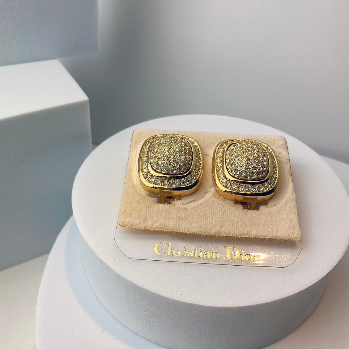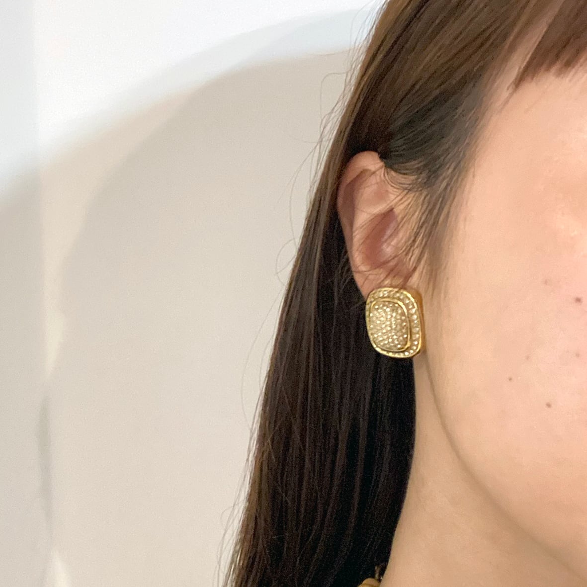 Christian Diorのヴィンテージイヤリング。立体的なクッション型のゴールドメタルに、繊細なラインストーンをびっしりと敷き詰めたラグジュアリーなデザイン。