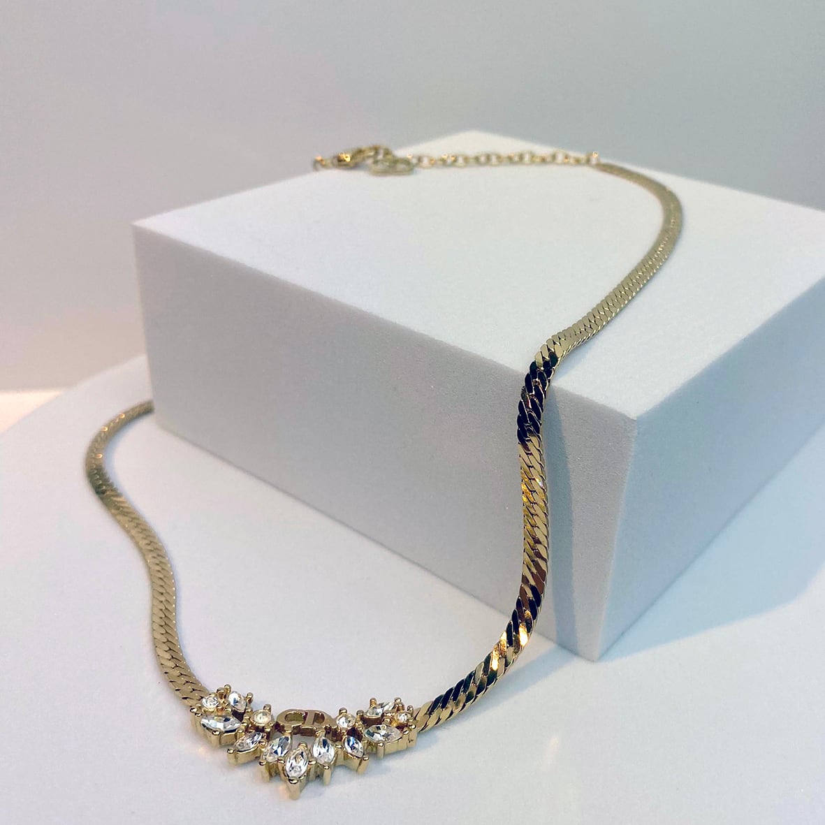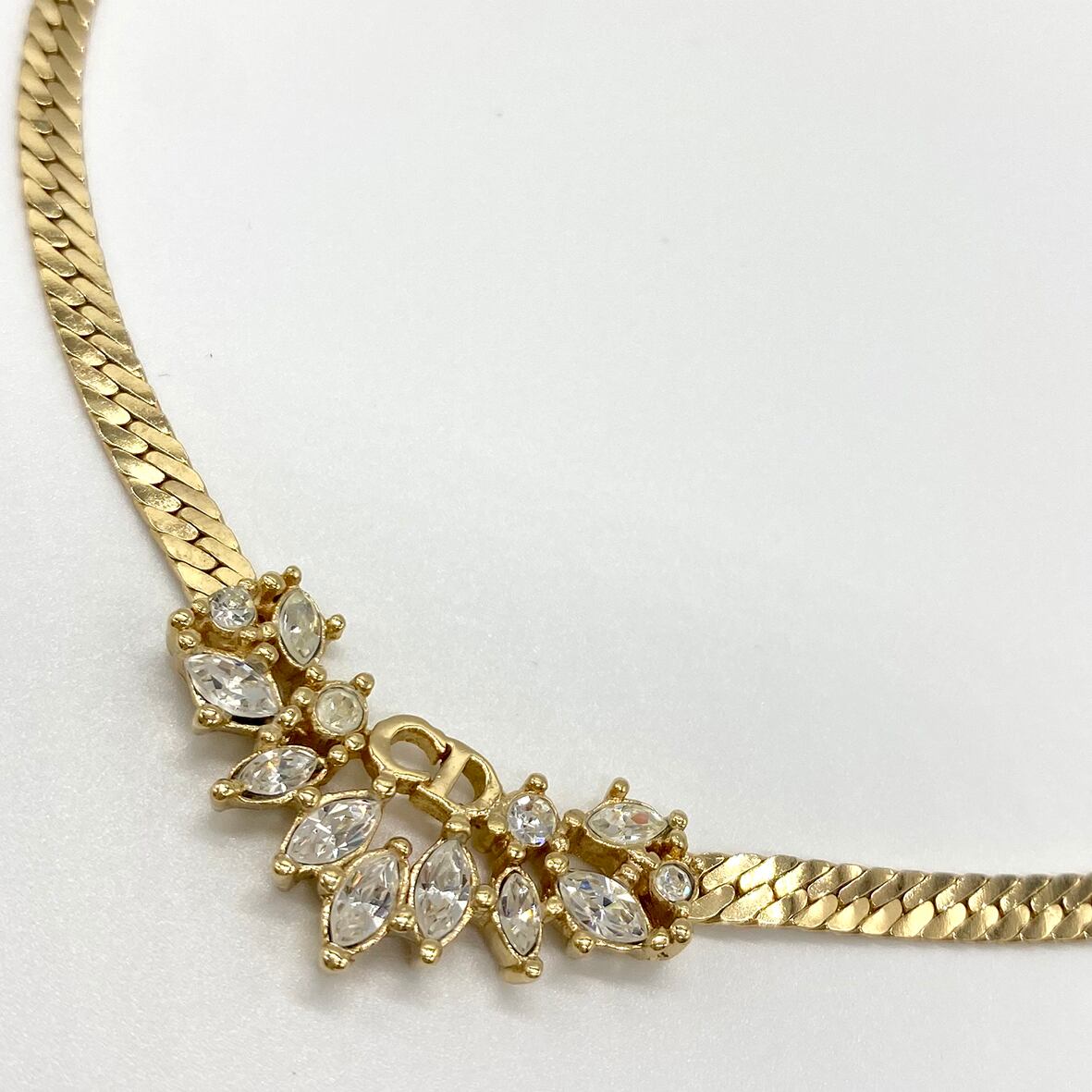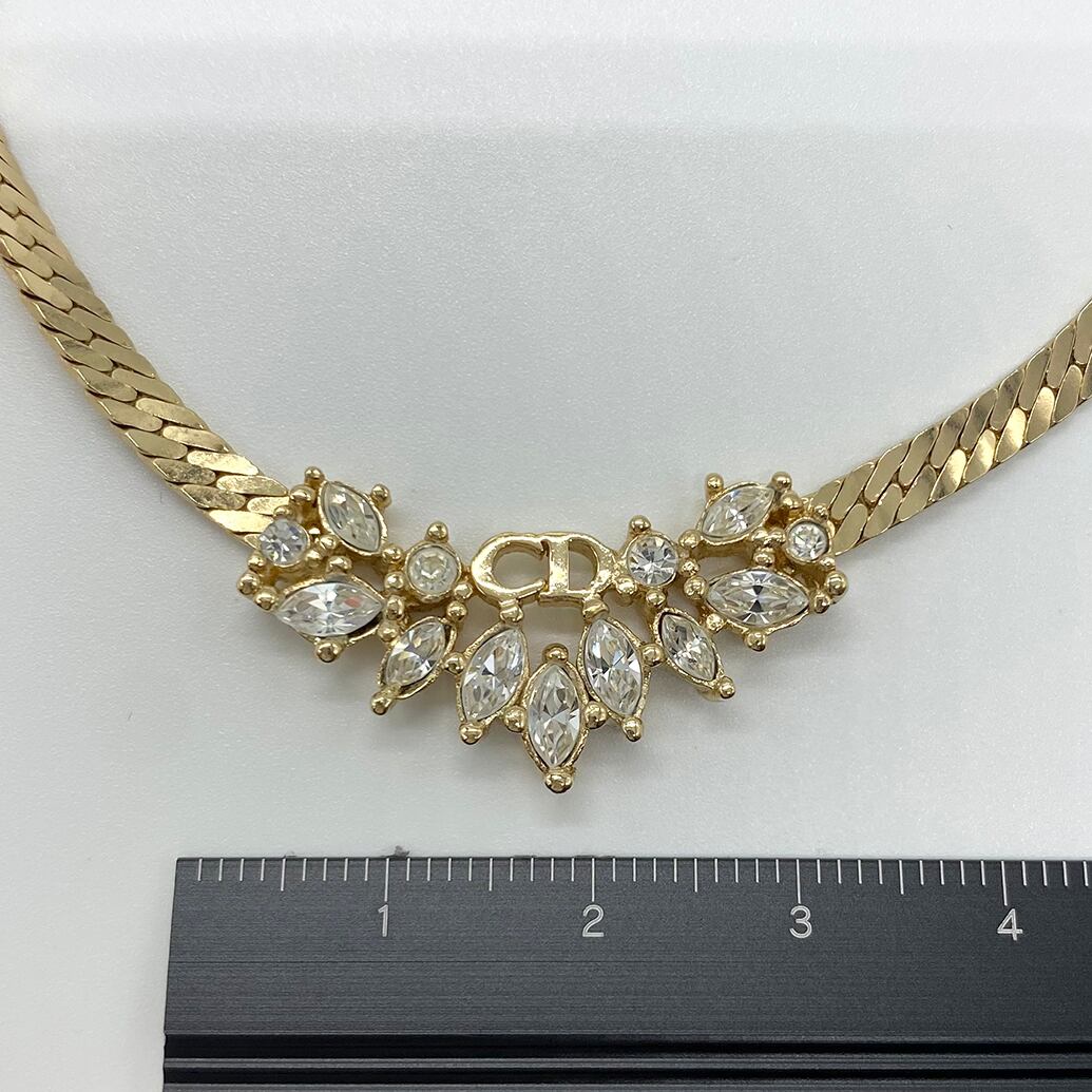 Christian Diorのゴールドトーンチェーンネックレス。しなやかな喜平調チェーンの中央に、マーキスカットを思わせるクリスタルモチーフを配した、上品さと華やかさを併せ持つデザインです。