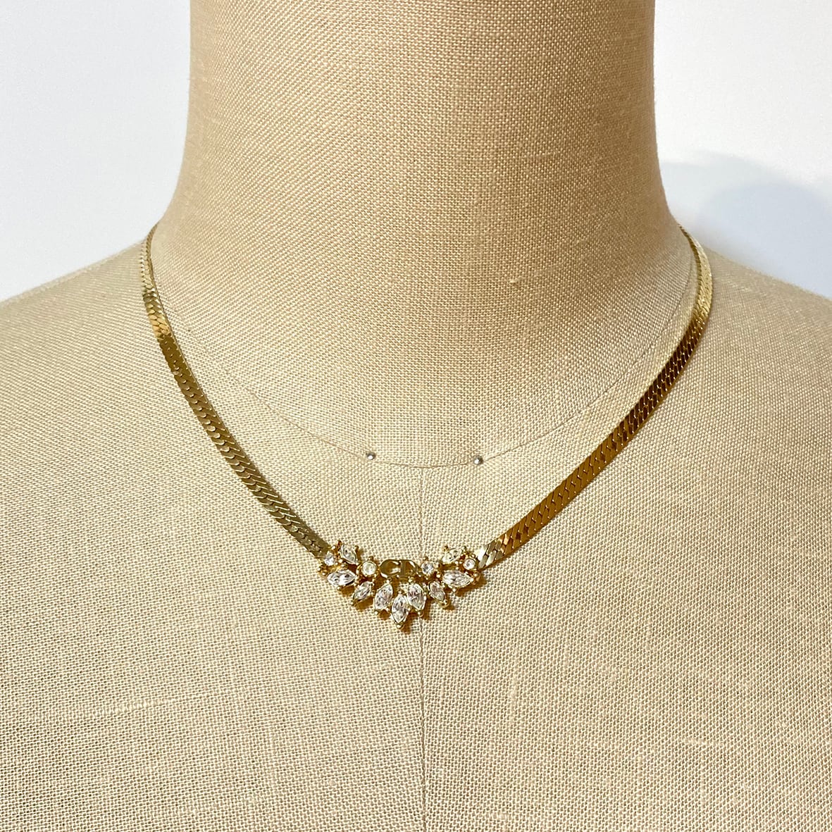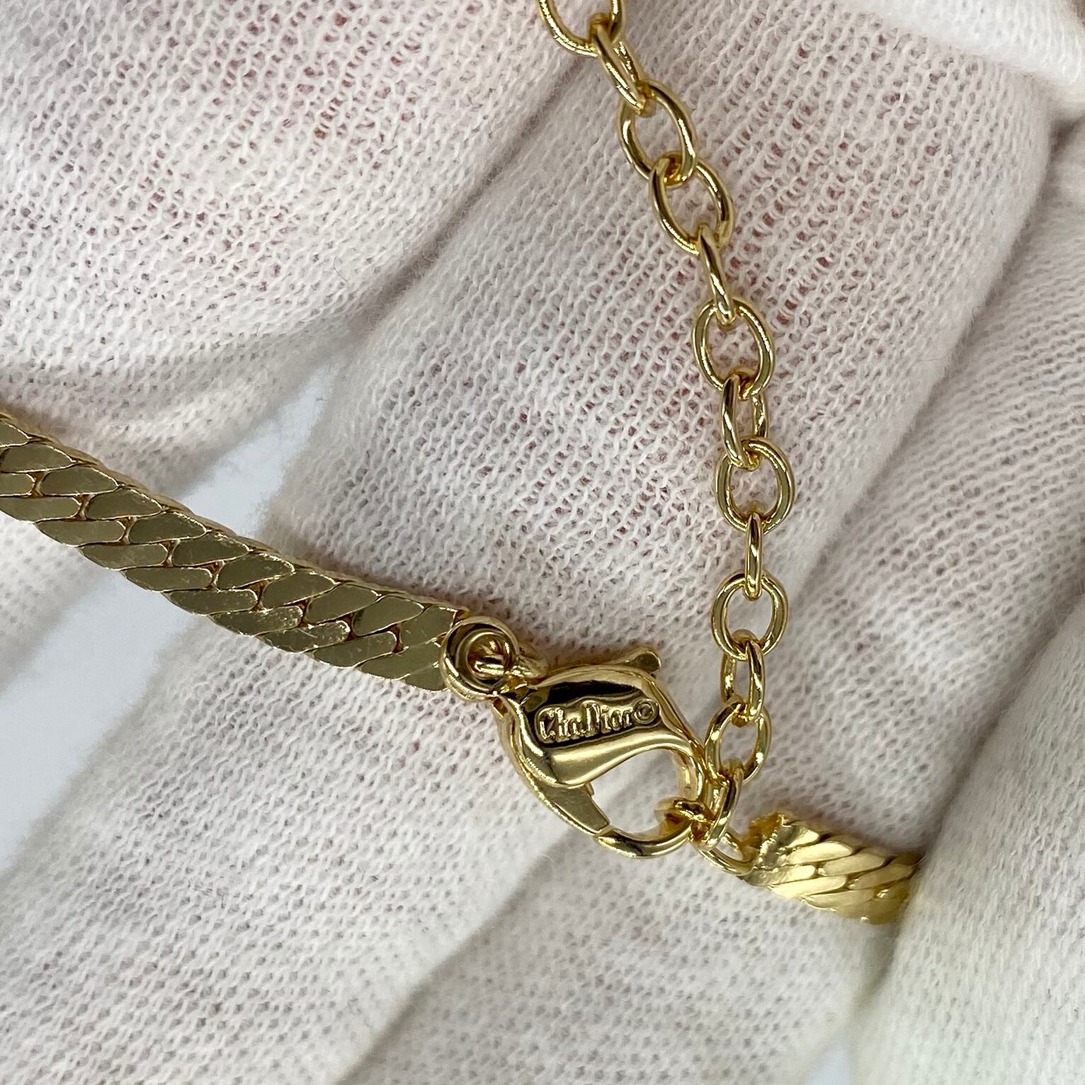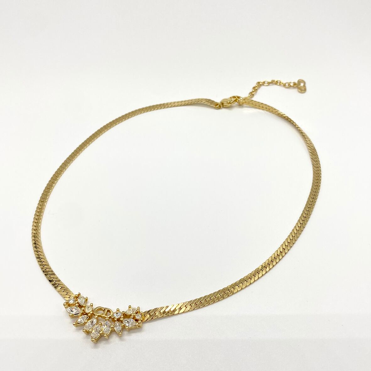 Christian Diorのゴールドトーンチェーンネックレス。しなやかな喜平調チェーンの中央に、マーキスカットを思わせるクリスタルモチーフを配した、上品さと華やかさを併せ持つデザインです。