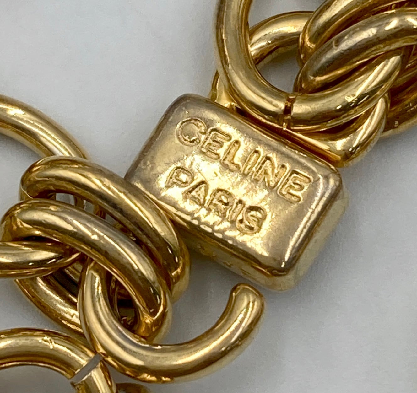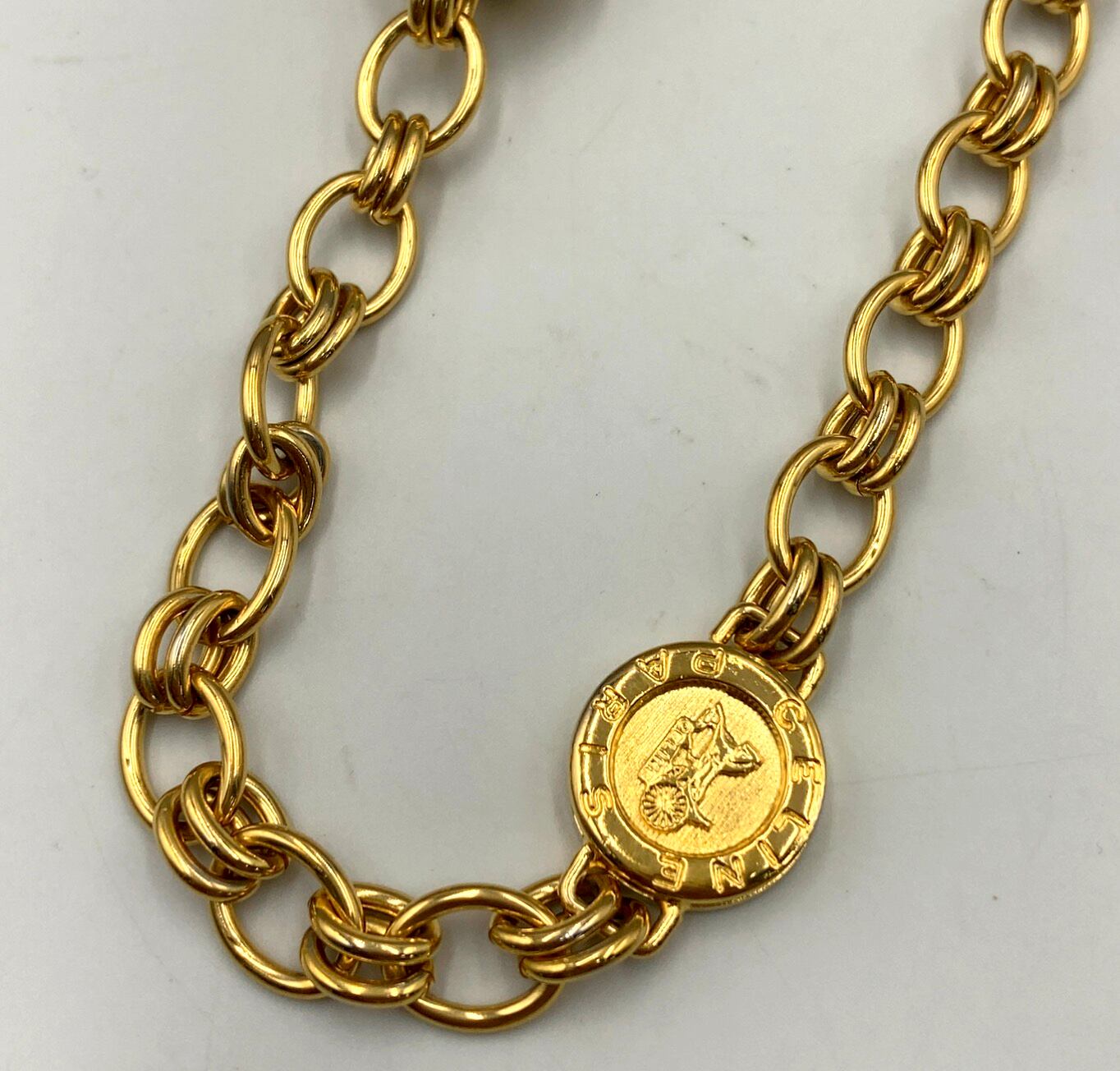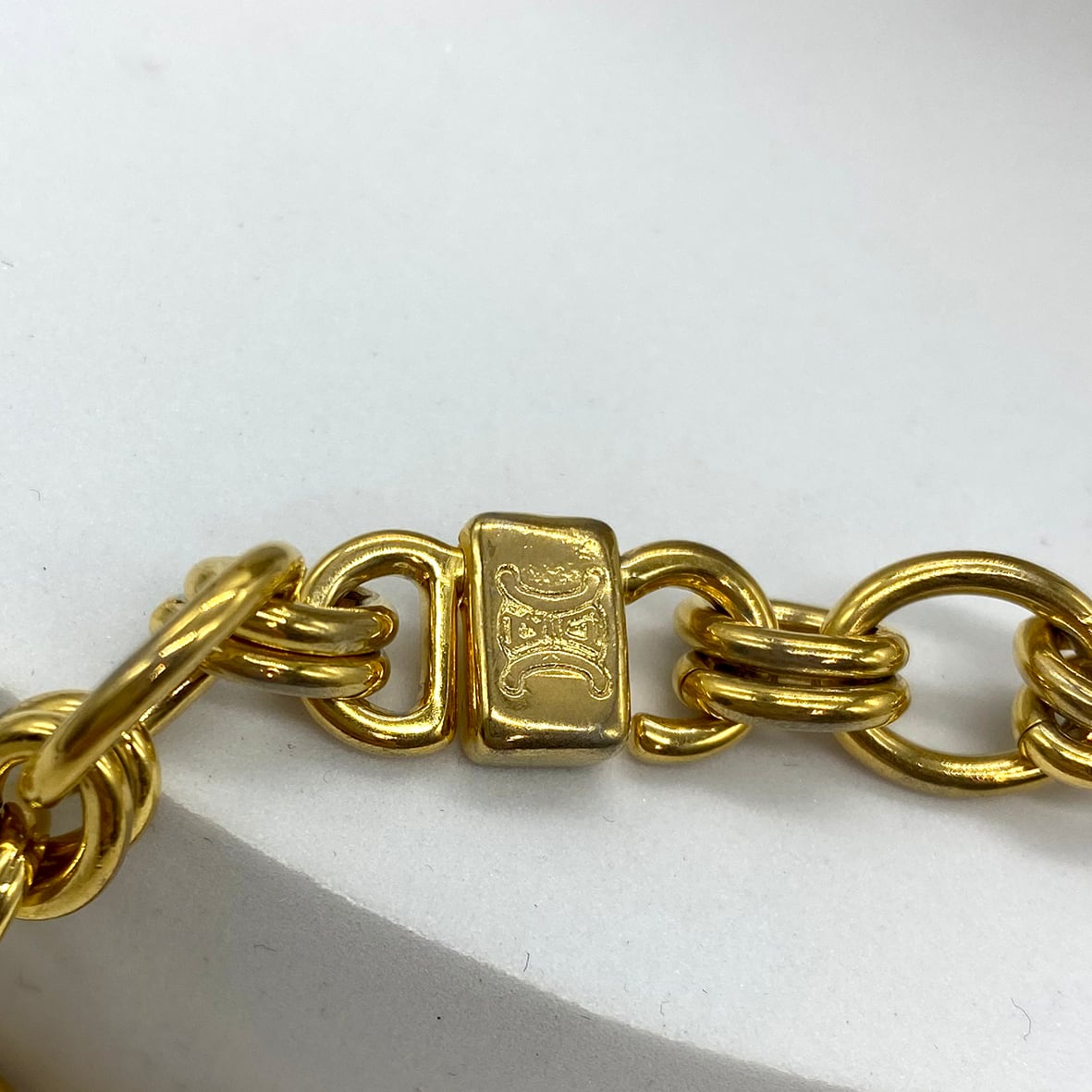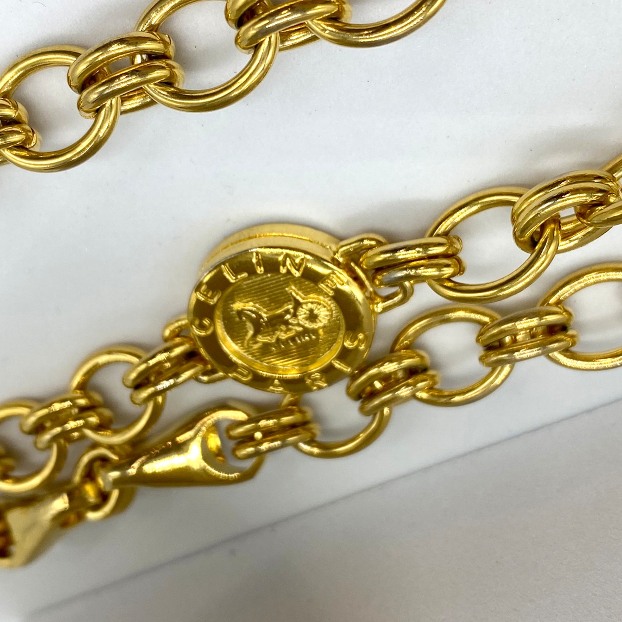 重厚感のあるゴールドトーンのチェーンに、トリオンフ刻印入りのサークルモチーフやリングパーツを組み合わせたデザインで、90年代前後のセリーヌらしいクラシカルかつ力強い佇まいが魅力です。