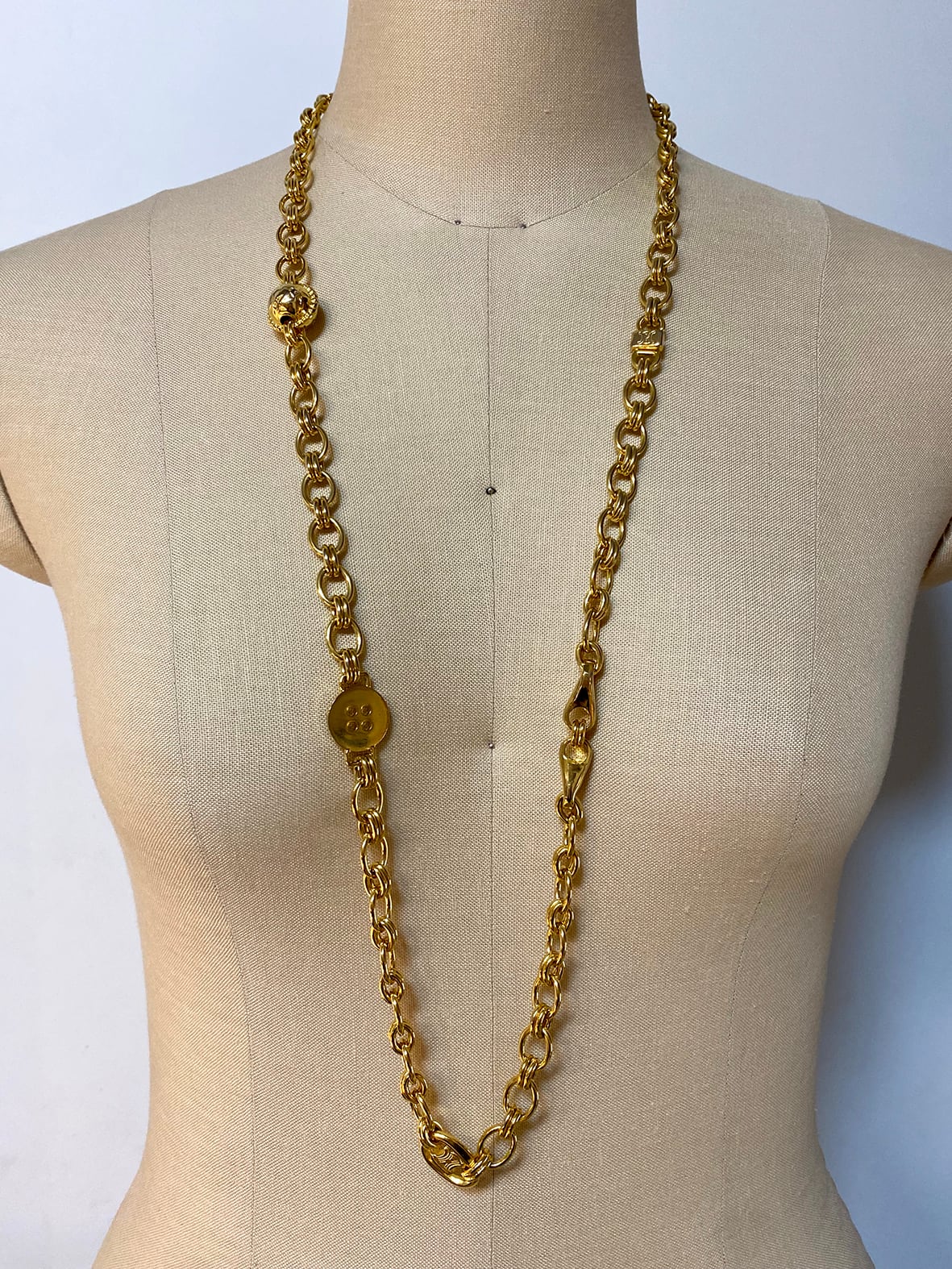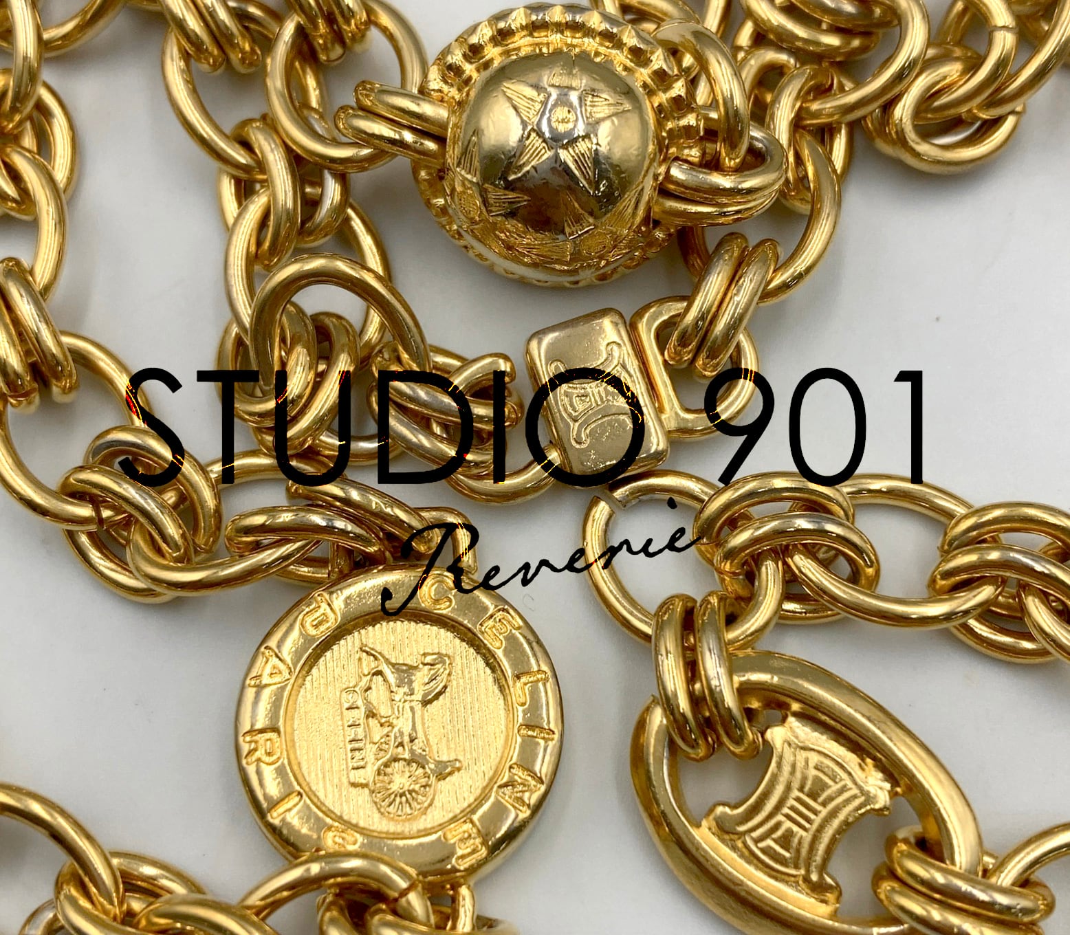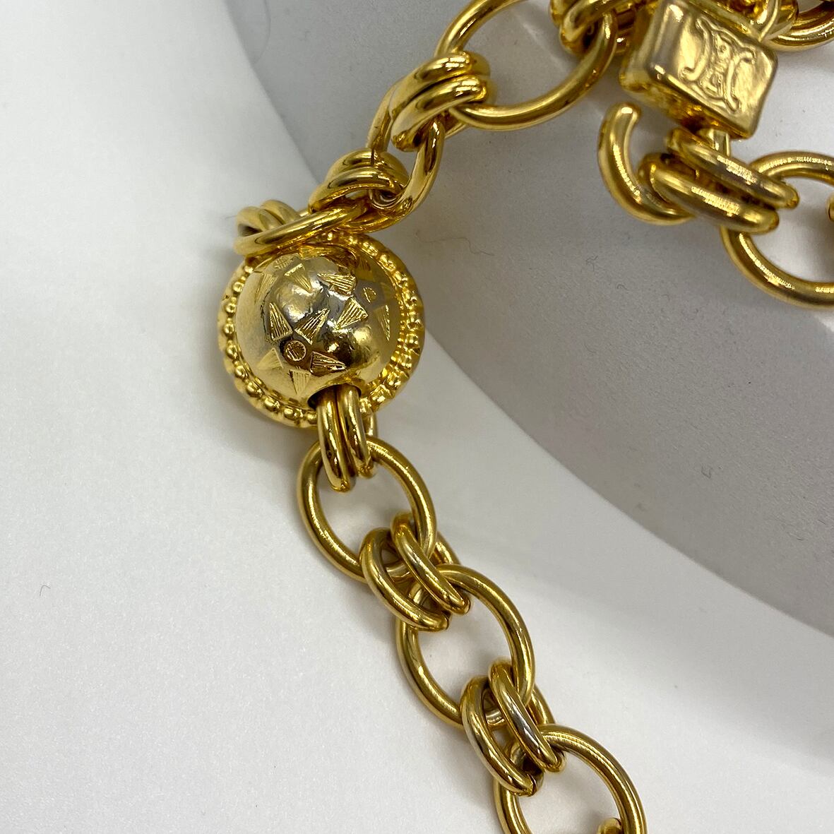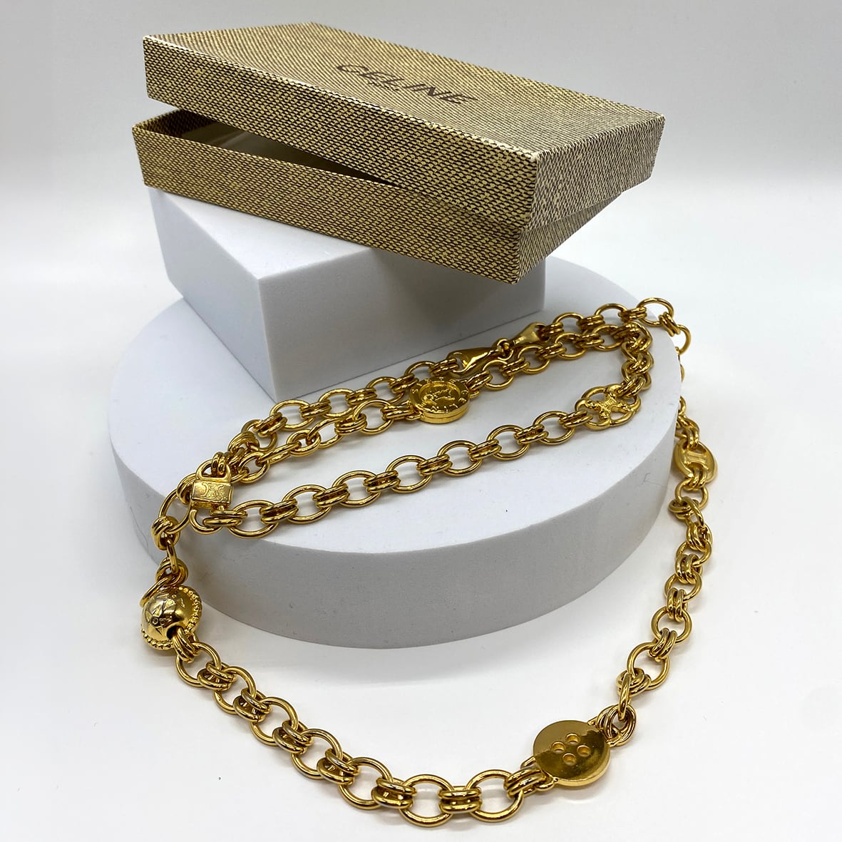 重厚感のあるゴールドトーンのチェーンに、トリオンフ刻印入りのサークルモチーフやリングパーツを組み合わせたデザインで、90年代前後のセリーヌらしいクラシカルかつ力強い佇まいが魅力です。