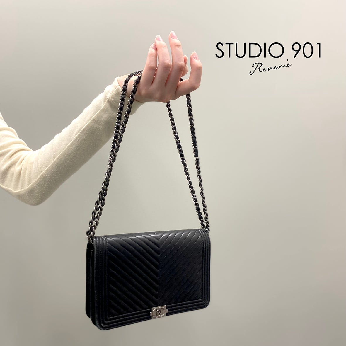シャープなVステッチキルティングとスクエア型のボーイロック金具が特徴で、クラシックラインとは異なるモード感のあるデザイン。